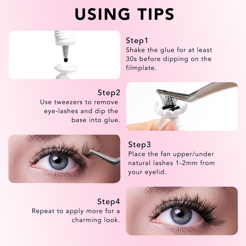 Taikymo procesas yra greitas ir lengvas. Pradėkite pasirinkdami norimas blakstienų grupes ir išdėstyti jas ant lygaus paviršiaus. Tada ant kiekvieno klasterio pagrindo užtepkite nedidelį kiekį mūsų „pasidaryk pats“ blakstienų klasterio klijų. Leiskite „pasidaryk pats“ blakstienų klasterio klijams keletą sekundžių išdžiūti ir švelniai paspauskite klasterius ant natūralių blakstienų.